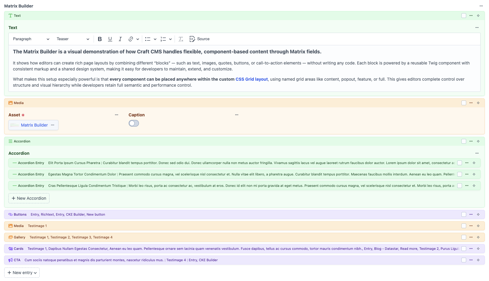 The Matrix Builder comes with ready-to-use components like headline-text blocks, images, sliders, accordions, quotes, links, and FAQs. Each block is built on centralized Twig templates, making your content scalable, responsive, and easy to maintain — ideal for modern websites and professional content strategies.